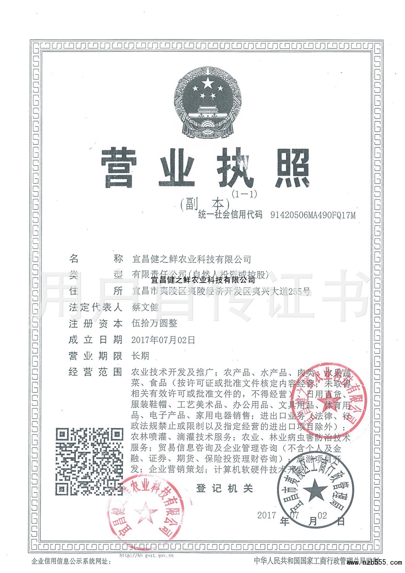 | 發(fā)證機(jī)構(gòu): | 宜昌市夷陵區(qū)工商行政管理局 | 發(fā)證時間 : | 2017-07-02 |