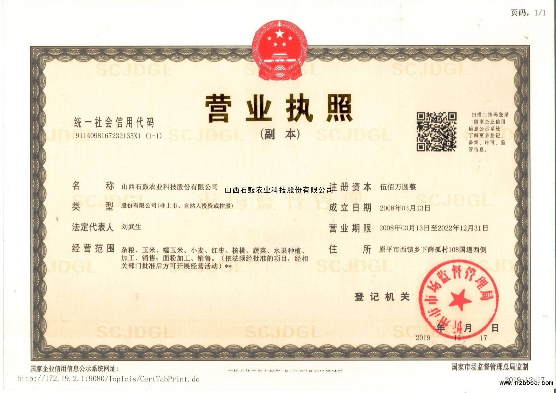| 發(fā)證機(jī)構(gòu): | 忻州市市場(chǎng)監(jiān)督管理局 | 發(fā)證時(shí)間 : | 2019-12-17 |