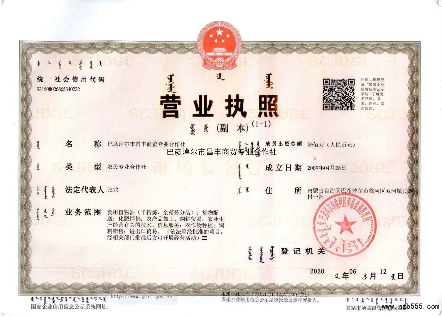 | 發(fā)證機(jī)構(gòu): | 巴彥淖爾市臨河區(qū)市場監(jiān)督管理局 | 發(fā)證時間 : | 2020-06-12 |