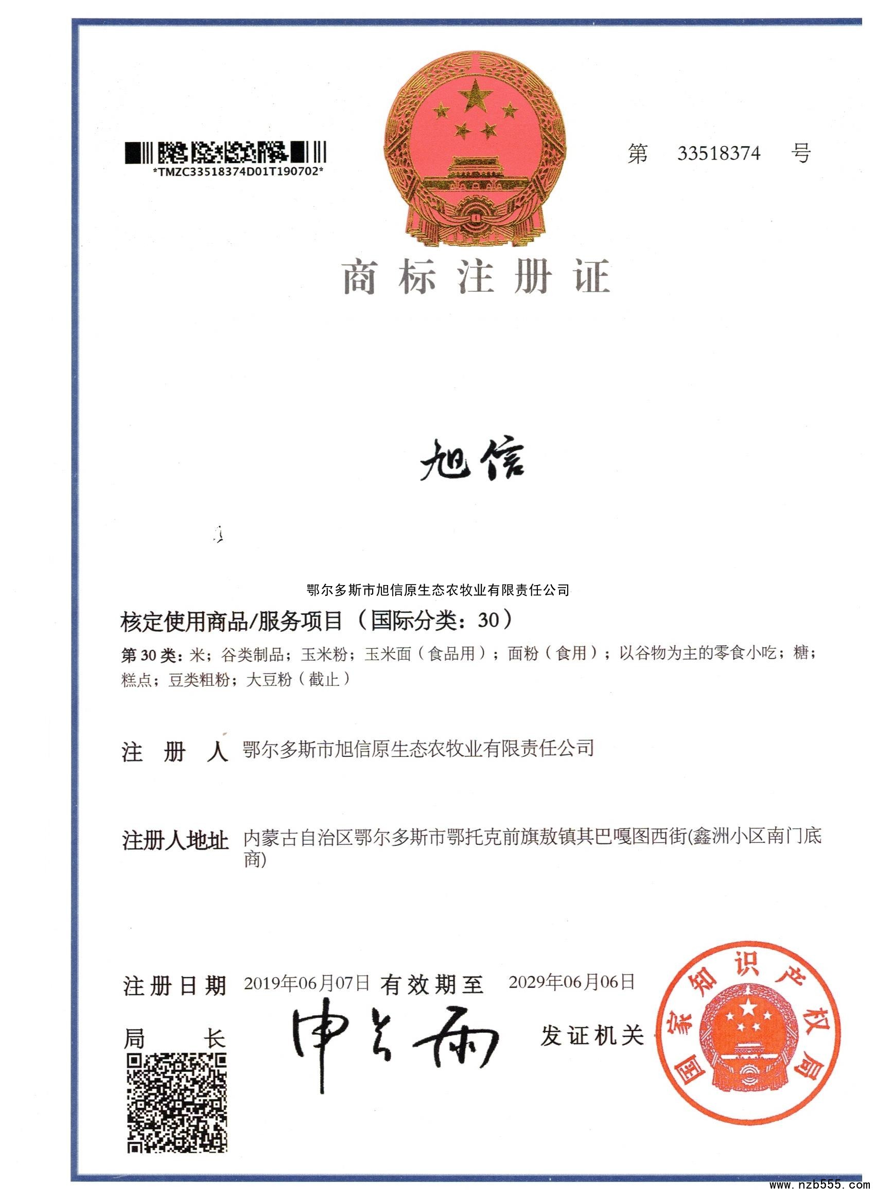 商標注冊證 旭信 第30類