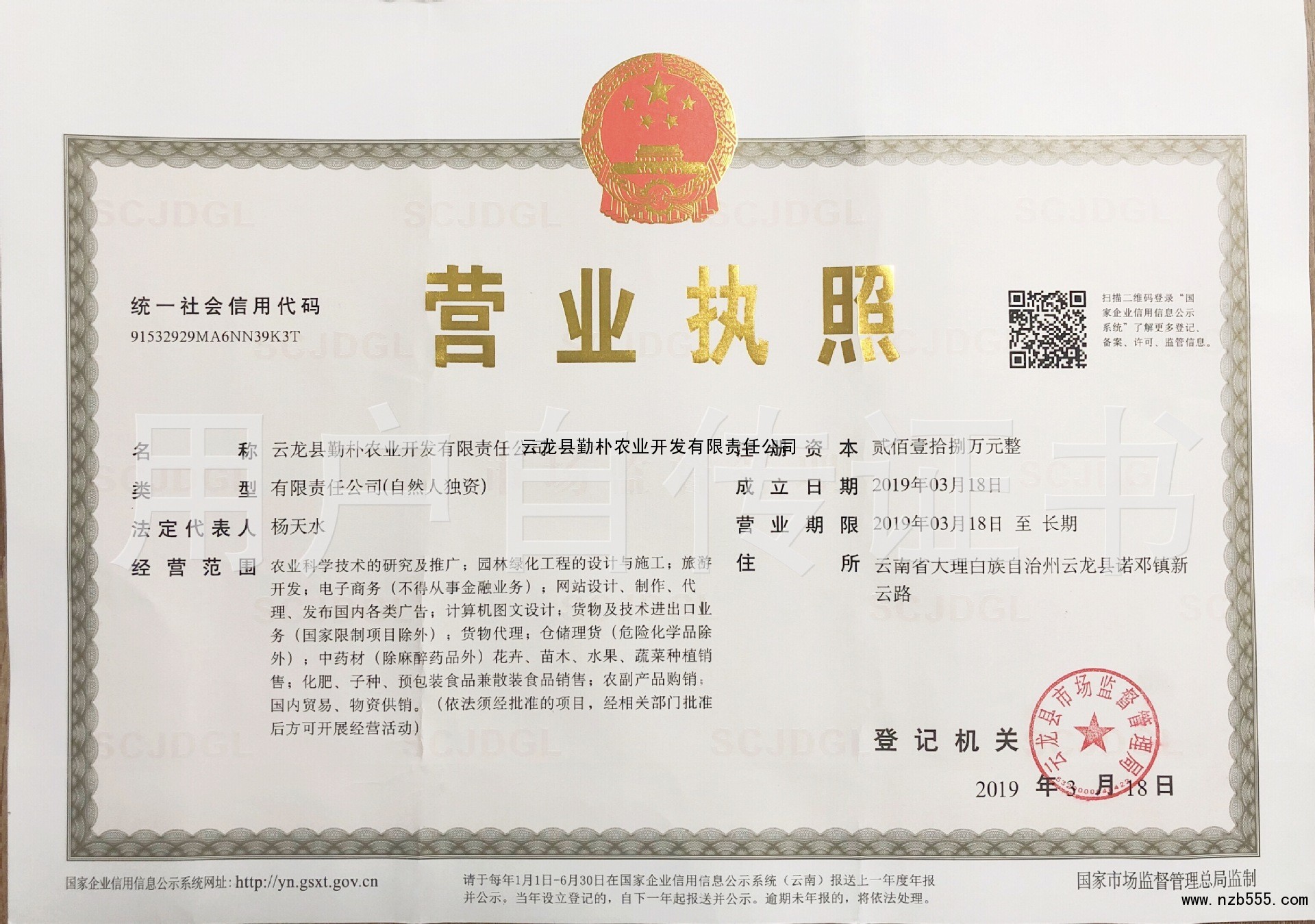 | 發(fā)證機(jī)構(gòu): | 云龍縣市場監(jiān)督管理局 | 發(fā)證時間 : | 2019-03-18 |