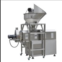 擠壓機主要用于物料成型。設備有動力部分、擠出部分、喂料部分、成型部分等。設備帶有冷卻裝置,可調節(jié)內部溫度。控制有傳統(tǒng)按鈕式和PLC觸屏式兩種可選。設備功率為17kw,出料速度通過變頻調節(jié),可生產顆粒,條狀,片狀流體等產品,產量在500Kg/h左右(物料特性會有差別)。