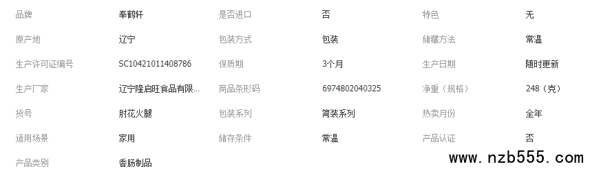 配料:豬肉、雞肉、飲用水、淀粉(≤2%)、大豆分離蛋白、食用鹽、白砂糖、天然香辛料